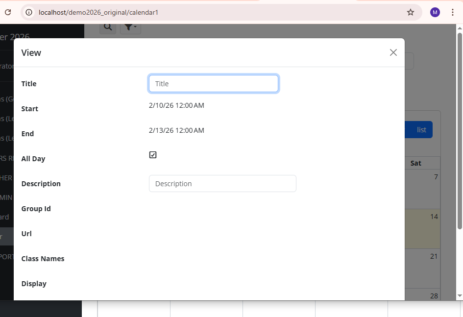 <div class="container-view" id="calendar-view"> <div class="row row-cols-1"> <div id="r__Title" class="col-sm-12 col-md-12 col-lg-12"> <div class="row"> <label for="x__Title" class="col-sm-4 col-form-label">{{{caption _Title}}}</label> <div class="col-sm-8 col-form-data">{{{value _Title}}}</div> </div> </div> <div id="r_Start" class="col-sm-12 col-md-12 col-lg-12"> <div class="row"> <label for="x_Start" class="col-sm-4 col-form-label">{{{caption Start}}}</label> <div class="col-sm-8 col-form-data">{{{value Start}}}</div> </div> </div> <div id="r_End" class="col-sm-12 col-md-12 col-lg-12"> <div class="row"> <label for="x_End" class="col-sm-4 col-form-label">{{{caption End}}}</label> <div class="col-sm-8 col-form-data">{{{value End}}}</div> </div> </div> <div id="r_AllDay" class="col-sm-12 col-md-12 col-lg-12"> <div class="row"> <label for="x_AllDay" class="col-sm-4 col-form-label">{{{caption AllDay}}}</label> <div class="col-sm-8 col-form-data">{{{value AllDay}}}</div> </div> </div> <div id="r_Description" class="col-sm-12 col-md-12 col-lg-12"> <div class="row"> <label for="x_Description" class="col-sm-4 col-form-label">{{{caption Description}}}</label> <div class="col-sm-8 col-form-data">{{{value Description}}}</div> </div> </div> <div id="r_GroupId" class="col-sm-12 col-md-12 col-lg-12"> <div class="row"> <label for="x_GroupId" class="col-sm-4 col-form-label">{{{caption GroupId}}}</label> <div class="col-sm-8 col-form-data">{{{value GroupId}}}</div> </div> </div> <div id="r_Url" class="col-sm-12 col-md-12 col-lg-12"> <div class="row"> <label for="x_Url" class="col-sm-4 col-form-label">{{{caption Url}}}</label> <div class="col-sm-8 col-form-data">{{{value Url}}}</div> </div> </div> <div id="r_ClassNames" class="col-sm-12 col-md-12 col-lg-12"> <div class="row"> <label for="x_ClassNames" class="col-sm-4 col-form-label">{{{caption ClassNames}}}</label> <div class="col-sm-8 col-form-data">{{{value ClassNames}}}</div> </div> </div> <div id="r_Display" class="col-sm-12 col-md-12 col-lg-12"> <div class="row"> <label for="x_Display" class="col-sm-4 col-form-label">{{{caption Display}}}</label> <div class="col-sm-8 col-form-data">{{{value Display}}}</div> </div> </div> <div id="r_BackgroundColor" class="col-sm-12 col-md-12 col-lg-12"> <div class="row"> <label for="x_BackgroundColor" class="col-sm-4 col-form-label">{{{caption BackgroundColor}}}</label> <div class="col-sm-8 col-form-data">{{{value BackgroundColor}}}</div> </div> </div> </div> </div> -