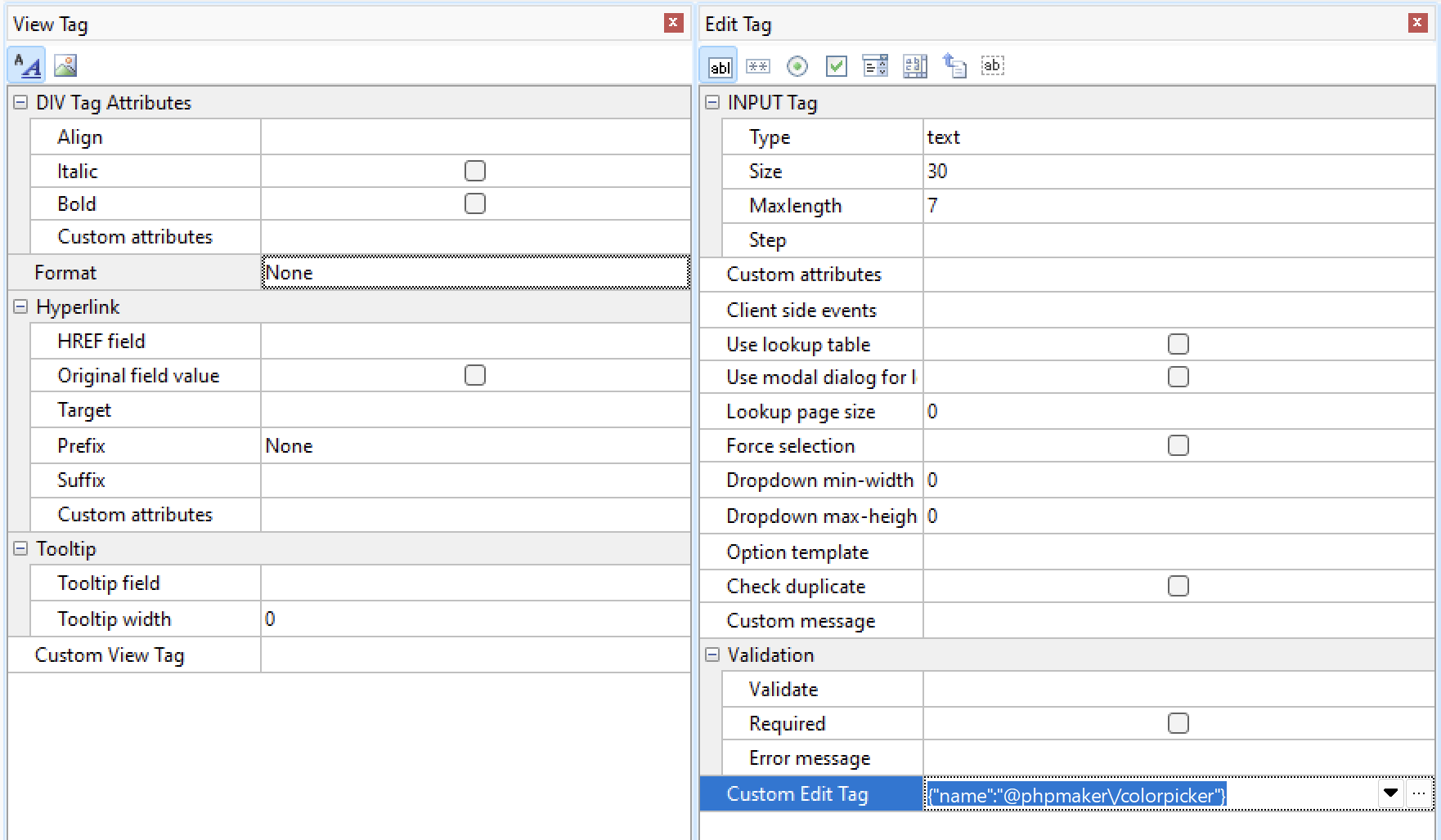 3. Changed “Custom Edit Tag” to {"name":"@phpmaker/colorpicker"}