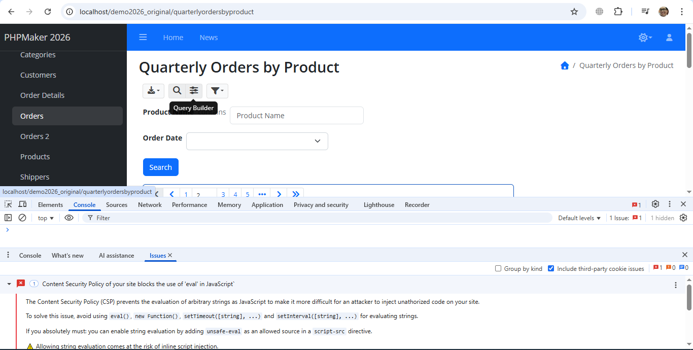Just go to generated “Quarterly Orders by Product” Report page, then click on “Query Builder” icon, but the Query Builder window will never shown up, not sure whether the issue caused by the following message: “Content Security Policy of your site blocks the use of ‘eval’ in Javascript“: