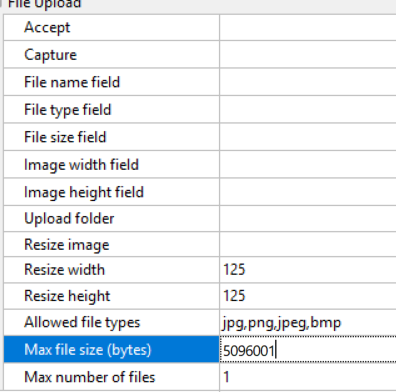 You need to set the field size in your database. In your screenshot, the field is a binary field of size 1 only, too small to store your uploaded file. (Note that the Max file size (bytes) setting in the screenshot is the max file size of the uploaded file, not the field size for storing the uploaded file.)